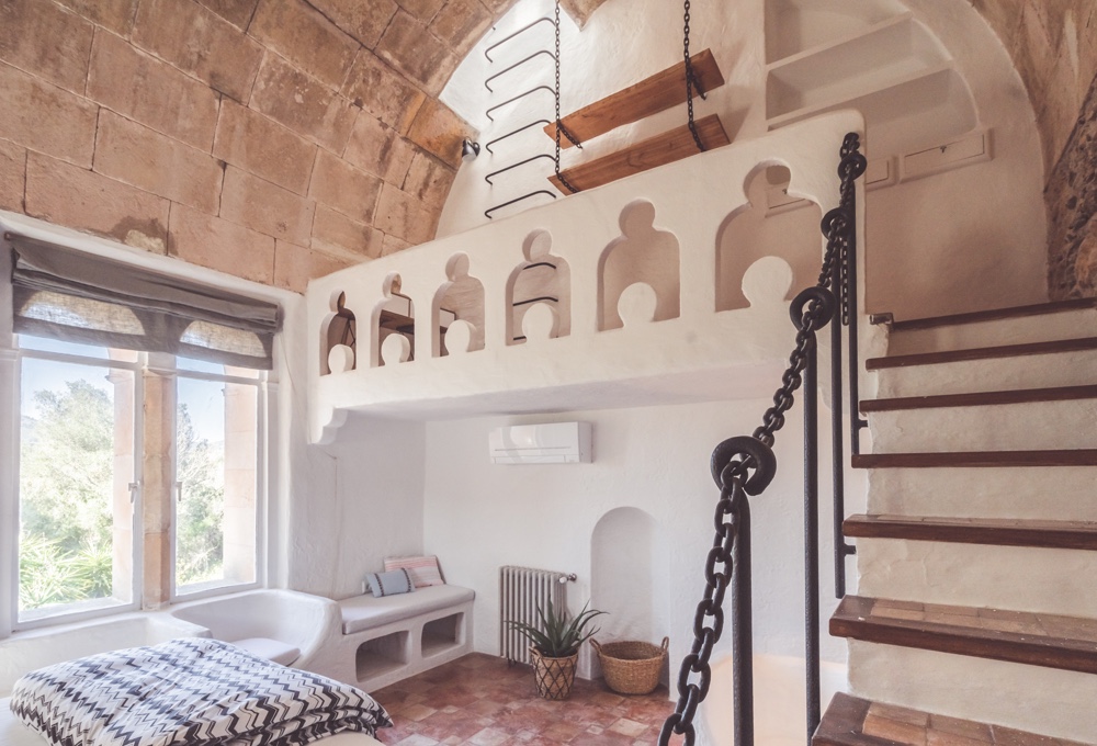 Das Besondere der Finca zeigt sich auch in den Schlafzimmern im Haupthaus: Wohnen im mittelalterlichen Turm? Mit Dachterrasse zum Meer? Oder besonders leicht zugänglich im Erdgeschoss Richtung Garten? Alle Räume haben eine individuelle Note und doch eines gemeinsam: Hier schläft es sich superbequem, in weicher Wäsche auf Boxspring- Betten.