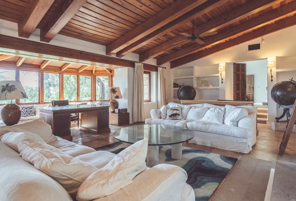 In der Gruppe kochen? Im Schatten arbeiten? In Ruhe ein Buch lesen? Oder gemeinsam einen Film gucken? Der großzügige Wohn- und Essbereich mit der offenen Küche sowie der Bar-Raum und das Fernsehzimmer erlauben es, dass man nicht aufeinander hocken muss. Wobei sich das Leben in den Sommermonaten ohnehin meist unter der “Porche” oder am Pool abspielt.